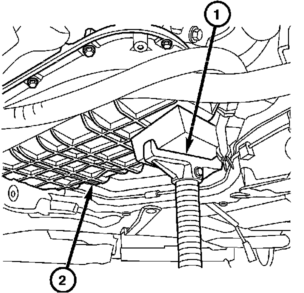 11. Safely install a support jack (1), under the left side of the engine. Raise the engine (2) approximately 40 mm (2 inch).