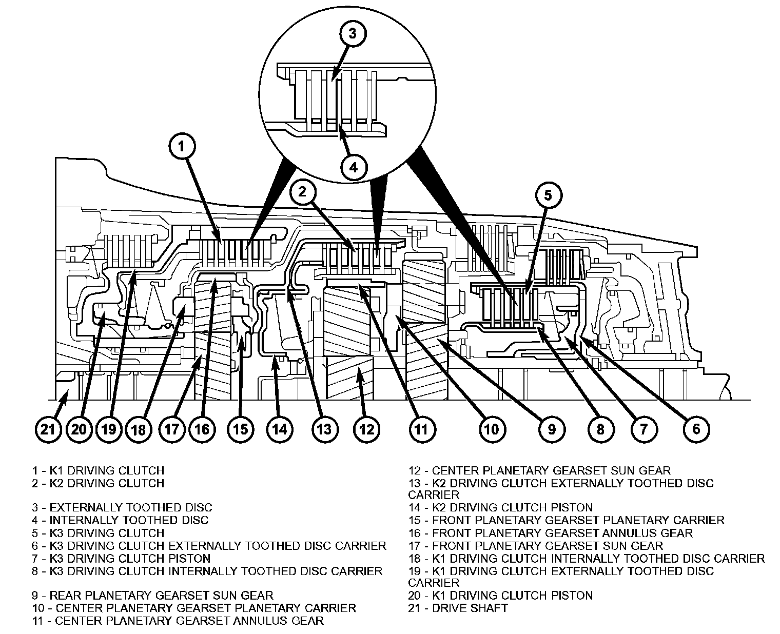 Three multi-plate driving clutches the front, middle and rear multi-plate clutches K1 (1), K2 (2) and K3 (5), are located in the planetary gear sets in the transmission housing.