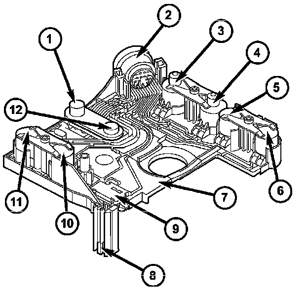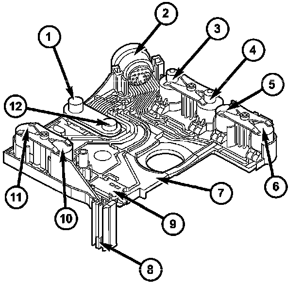 The electrical control unit (7) consists of a plastic shell which houses the RPM sensors (1,12), regulating solenoid valves (3, 4), solenoid valves (5, 6, 10), the TCC solenoid valve (11), the park/neutral contact (9), and the transmission oil temperature sensor (8). Conductor tracks integrated into the shell connect the electric components to a plug connection (2). This 13-pin plug connection (2) establishes the connection to the vehicle side cable harness and to the transmission control module (TCM). With the exception of the solenoid valves, all other electric components are fixed to the conductor tracks.