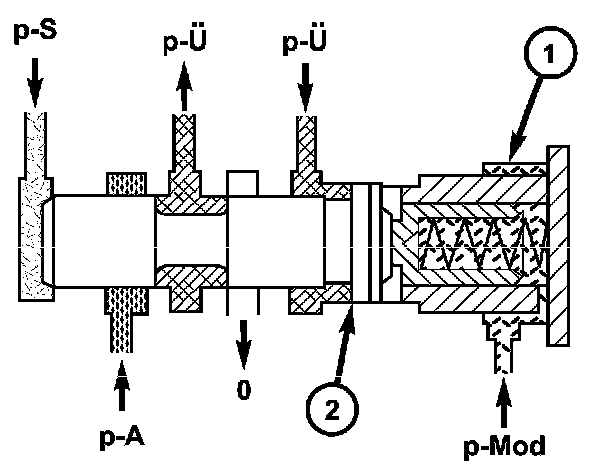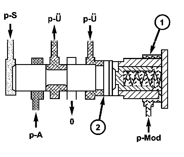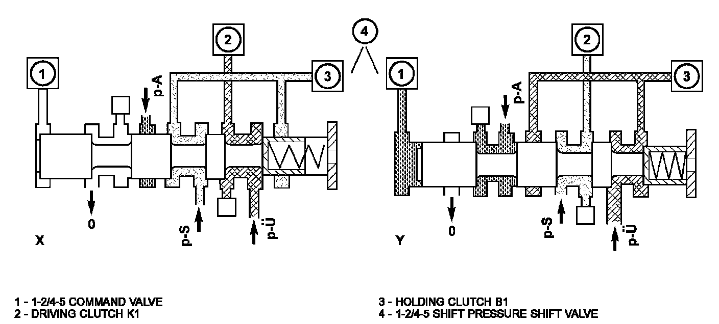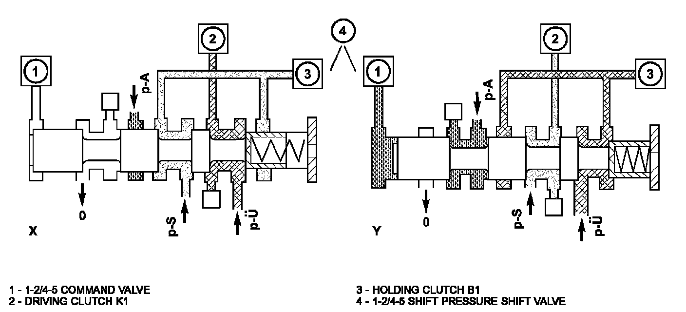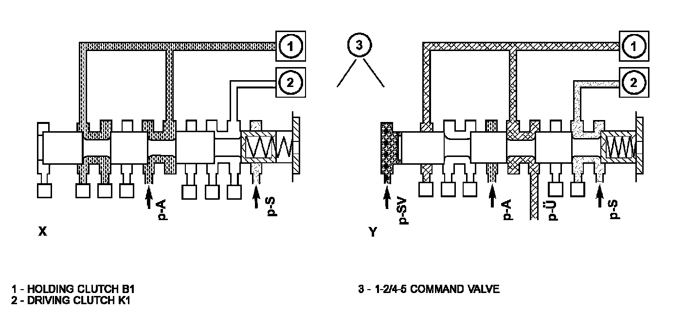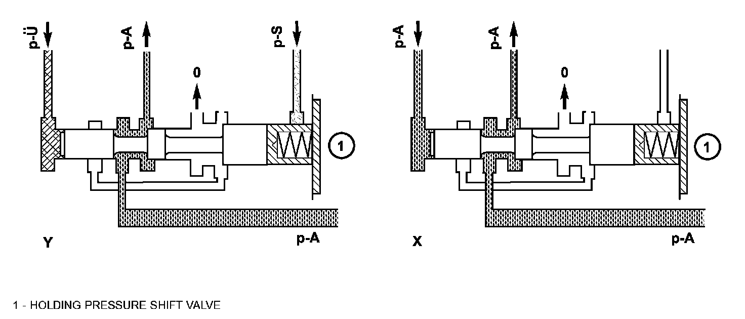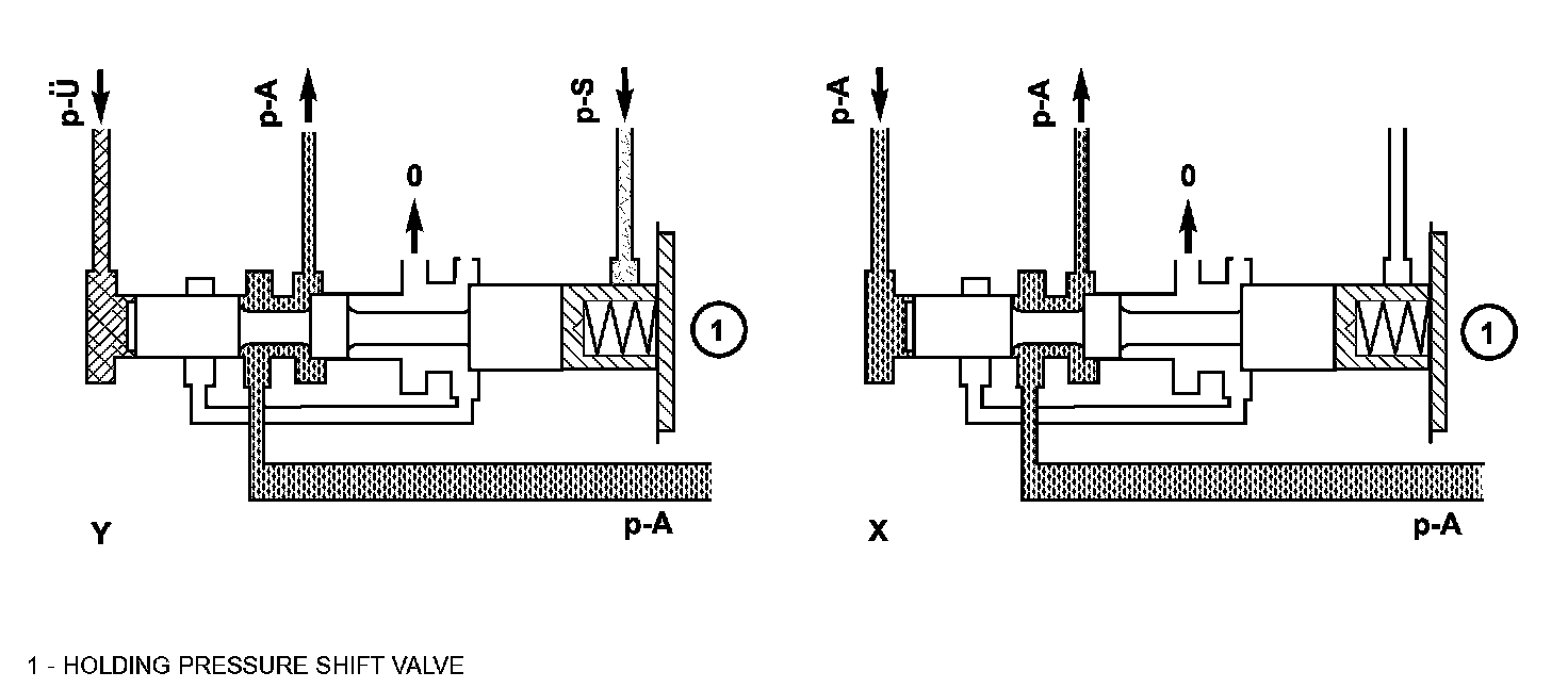 The holding pressure shift valve is actuated by the pressures present at the end face in the actuators and a spring. It assigns the working pressure to the actuator with the higher pressure (taking into account the spring force and the effective surface area). The other element of the shift group is then unpressurized. The valve switches over only during the shift phase and only at a certain pressure ratio between the overlap pressure (p-U) and the shift pressure (p-S).