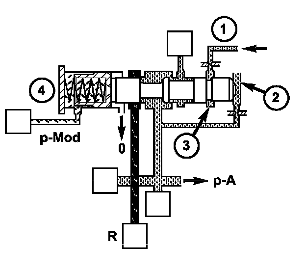 The working pressure (p-A) is regulated at the working pressure regulating valve (4) in relation to load (modulating pressure) and gear (K1 or K2 pressure). The spring in the working pressure regulating valve sets a minimum pressure level (basic pressure).