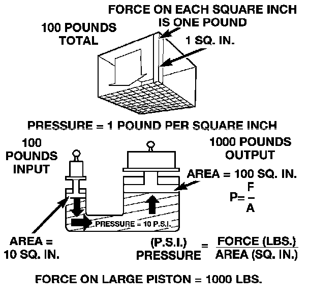 Pressure is nothing more than force (lbs.) divided by area (in or ft.), or force per unit area. Given a 100 lb. block and an area of 100 sq. in. on the floor, the pressure exerted by the block is: 100 lbs. 100 in or 1 pound per square inch, or PSI as it is commonly referred to.