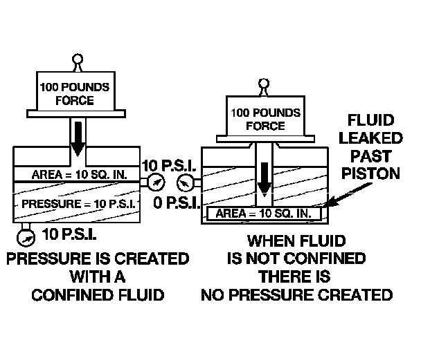 The principal which makes this operation possible is known as Pascal's Law. Pascal's Law can be stated as: "Pressure on a confined fluid is transmitted equally in all directions and acts with equal force on equal areas."