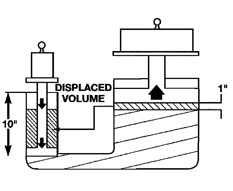 The relationship between hydraulic lever and a mechanical lever is the same. With a mechanical lever, it's a weight-to-distance output rather than a pressure-to-area output. Using the same forces and areas as in the previous example, the smaller piston has to move ten times the distance required to move the larger piston one inch. Therefore, for every inch the larger piston moves, the smaller piston moves ten inches. This principle is true in other instances also. A common garage floor jack is a good example. To raise a car weighing 2000 lbs., an effort of only 100 lbs. may be required. For every inch the car moves upward, the input piston at the jack handle must move 20 inches downward.