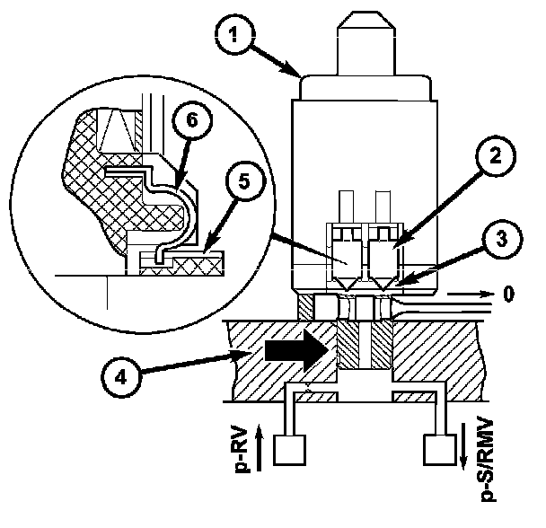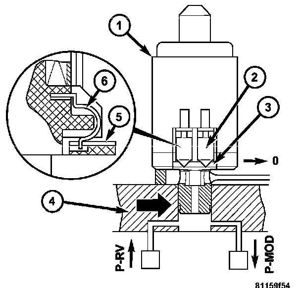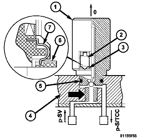 If a solenoid valve is actuated by the TCM, it opens and guides the control pressure (p-SV) to the assigned command valve. The solenoid valve remains actuated and therefore open until the shifting process is complete. The shift pressure (p-SV) to the command valve is reduced to zero as soon as the power supply to the solenoid valve is interrupted.