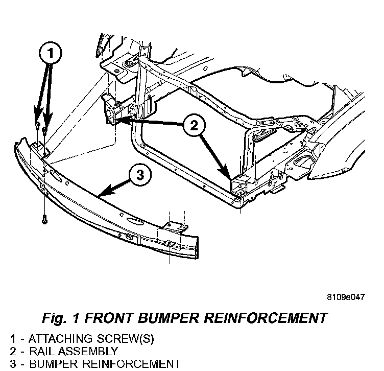 3. Remove the three bolts attaching front bumper reinforcement to frame rail (Fig. 1).