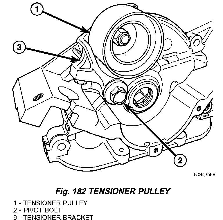 1) Install the timing belt tensioner pulley (1) (Fig. 183) assembly. Tighten the pivot bolt (2) to 61 Nm (45 ft. lbs.).
