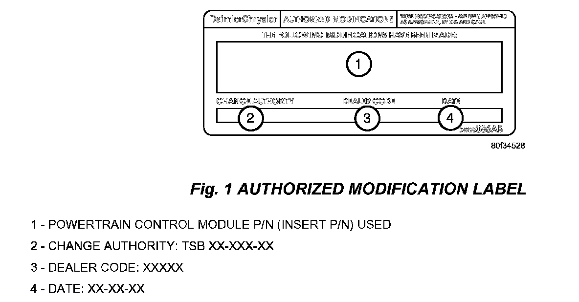 13. Type the necessary information on the "Authorized Modification Label" p/n 04275086AB and attach near the VECI label (Fig. 1).