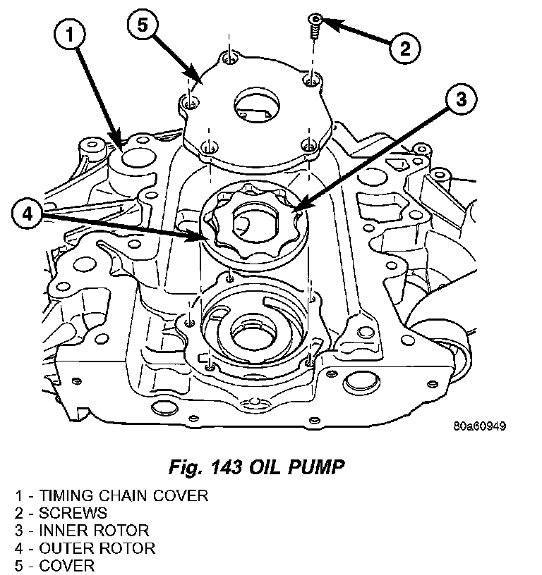 1) Remove oil pump cover screws, and lift off cover (Fig. 143).