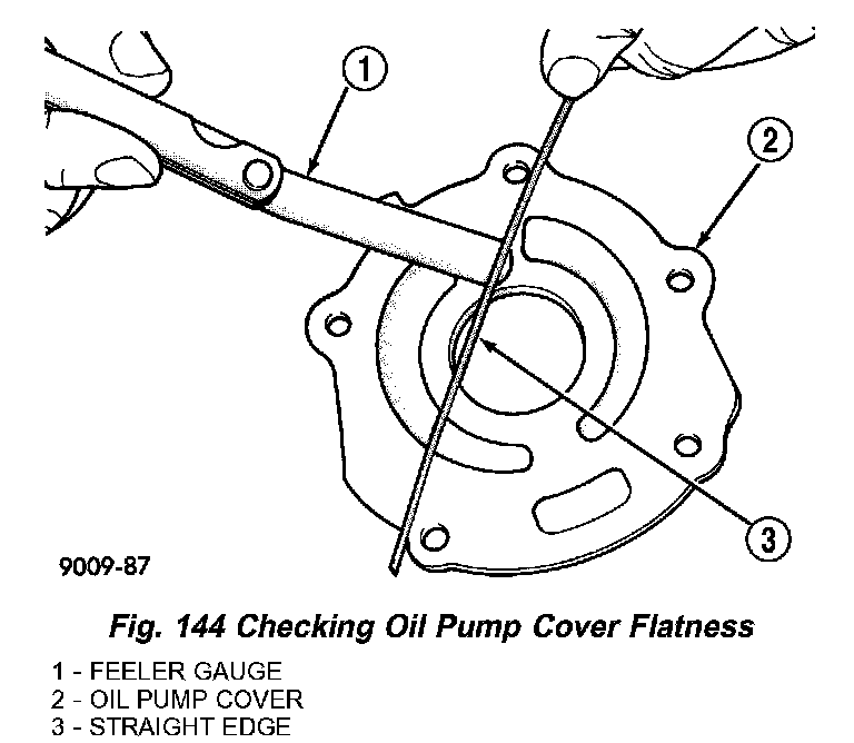 2) Lay a straightedge across the pump cover surface (Fig. 144). If a 0.025 mm (0.001 inch) feeler gauge can be inserted between cover and straight edge, cover should be replaced.