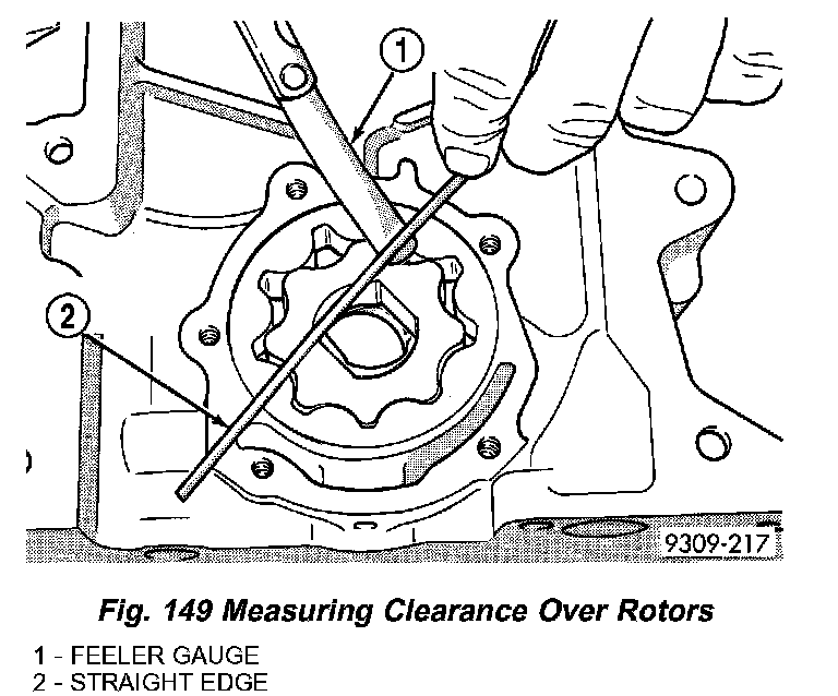 7) Place a straightedge across the face of the chain case cover, between bolt holes. If a feeler gauge of 0.10 mm (0.004 inch) or more can be inserted between rotors and the straightedge, replace pump assembly (Fig. 149). ONLY if rotors are in specs.