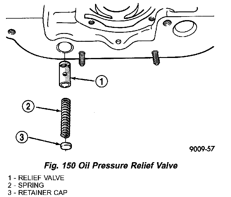 9) Inspect oil pressure relief valve and bore. Inspect for scoring, pitting and free valve operation in bore (Fig. 150). Small marks may be removed with 400-grit wet or dry sandpaper.