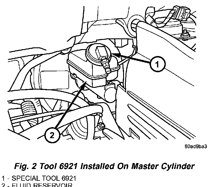 1) Install the Adapter Master Cylinder Pressure Bleed Cap, Special Tool 6921 on the fluid reservoir of the master cylinder (Fig. 2). Attach the fluid hose from the pressure bleeder to the fitting on Special Tool 692 1.