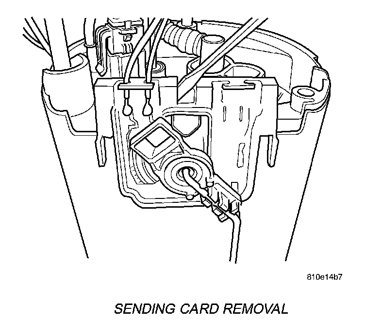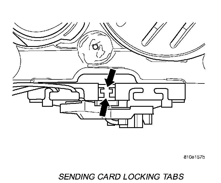 12. Remove fuel level sending card by prying on locking tab and pulling card down toward bottom of the pump module.