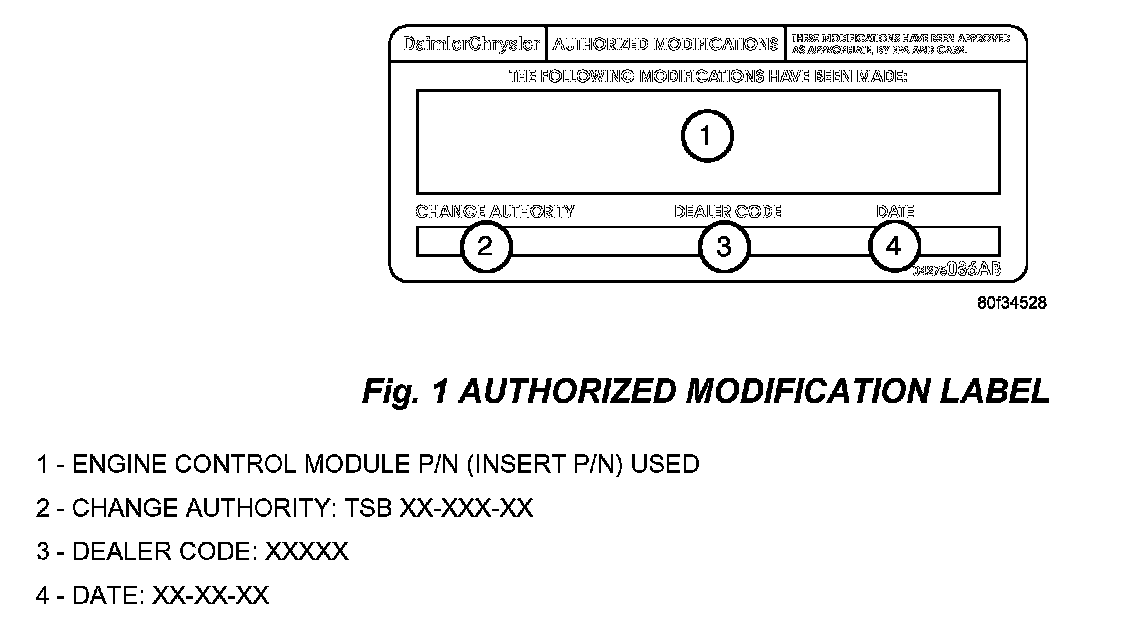 13. Type the necessary information on the "Authorized Modification Label" p/n 04275086AB and attach near the VECI label (Fig. 1).