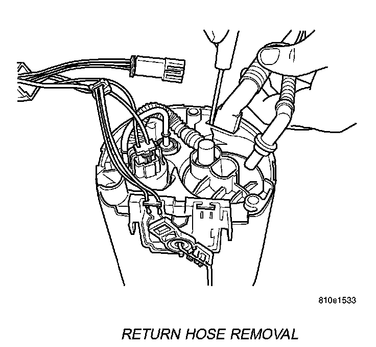 12. Remove return line from pump module. Use a small screwdriver to pry tab back and tip hose to one side. Pry tab on other side back to release hose.