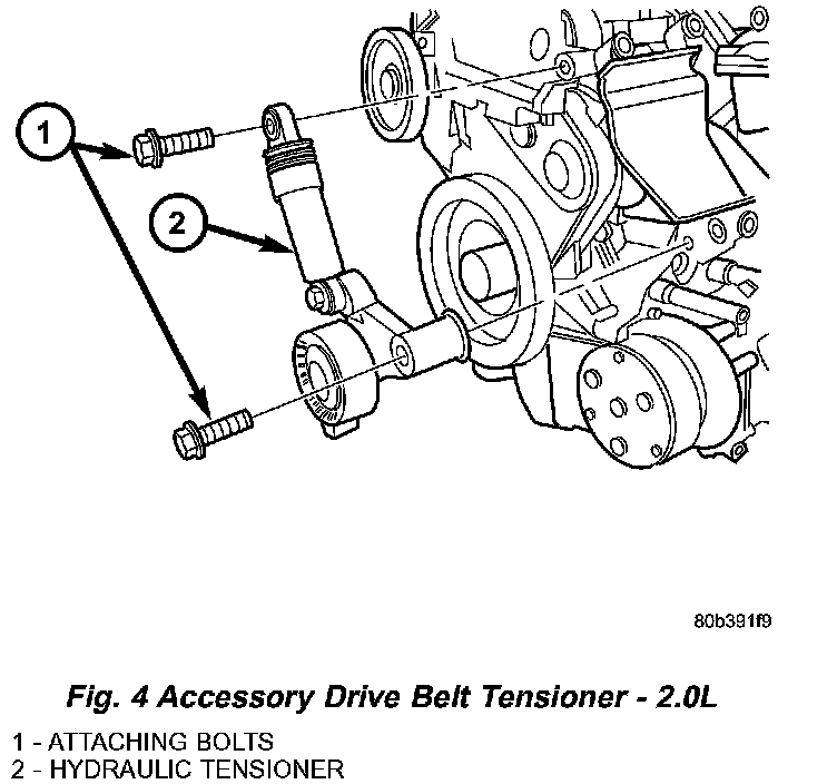 4. Gently apply a force to rotate belt tensioner clockwise until the belt tensioner bottoms out and the belt can be removed from pulleys (Fig. 4) or (Fig. 5).