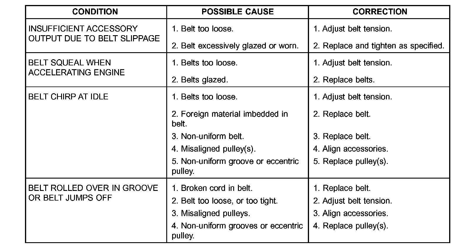 Satisfactory performance of the belt driven accessories depends on belt condition and proper belt tension.
