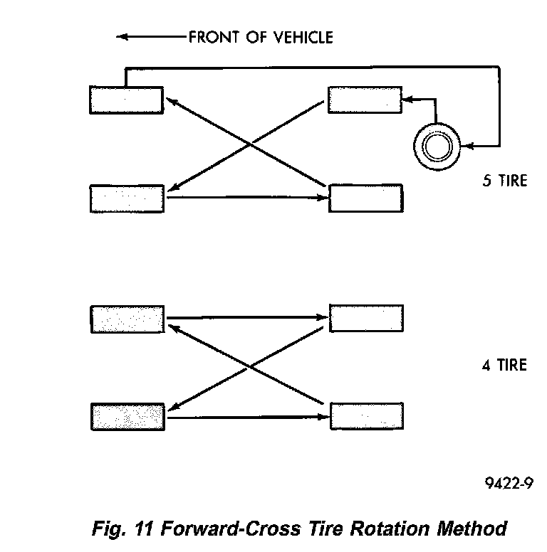 The suggested rotation method is the forward-cross tire rotation method (Fig. 11). This method takes advantage of current tire industry practice which allows rotation of radial-ply tires. Other rotation methods may be used, but may not have all the benefits of the recommended method.