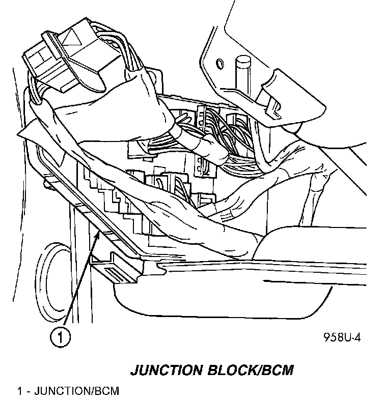 The Junction Block (JB) and Body Control Module (BCM) are attached to each other. After removal they can be separated. Junction Block and Body Control Module assemblies are located on the driver's side of the vehicle.