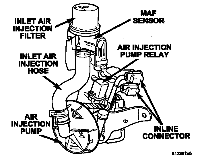 When the Air Injection Pump is activated, air is drawn into the Air Injection System through the Inlet Air Injection Filter. The air is then passed through the MAF Sensor, which monitors the amount of air that enters the Air Injection System. The PCM uses the MAF Sensor information to control Air Pump operation based on feedback from the front O2 sensor. After passing through the MAF Sensor, air travels through the Inlet Air Injection hose, into the Air Pump (where it is compressed), through the Air Injection (Nylon) Tube, past the Exhaust one-way check valve, and into the exhaust system.