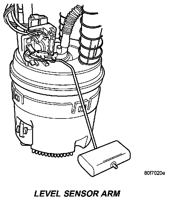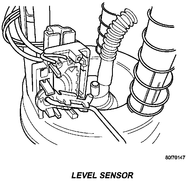 1. Depress retaining tab and remove the fuel pump/level sensor connector from the bottom of the fuel pump module electrical connector.