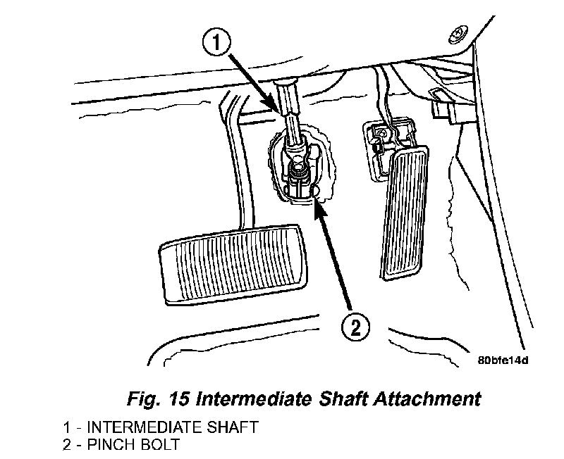 6. Under the instrument panel, reconnect the intermediate shaft to the steering gear shaft. To do so, align the flats and slide the intermediate shaft onto the steering gear shaft aligning the pinch bolt hole with the notch formed into the steering gear shaft. Install a new pinch bolt in the intermediate shaft coupler (Fig. 15), then tighten the pinch bolt to a torque of 44 Nm (32 ft. lbs.).