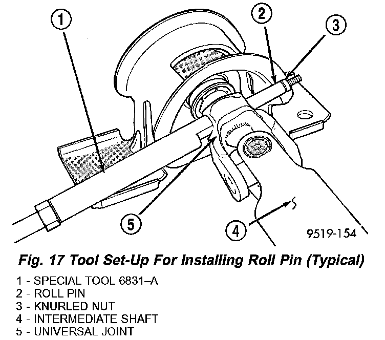 12. Install Remover/Installer, Special Tool 6831-A, through center of roll pin in intermediate shaft's universal joint and install knurled nut (Fig. 16).