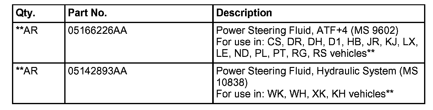 **MOPAR(R) Power Steering Fluid +4 or ATF+4 (MS-9602) is to be used in the power steering system of CS, DR, DH, DI, HB, JR, KJ, LX, LE, ND, PL, PT, RG, and RS vehicles. Mopar Hydraulic Power Steering Fluid (MS 10838) is to be used in the power steering system of WK, WH, XH, and XK vehicles. No other power steering or automatic transmission fluid is to be used in these systems. Damage may result to the power steering pump and system if the incorrect fluid is used. Do not overfill the power steering reservoir. **