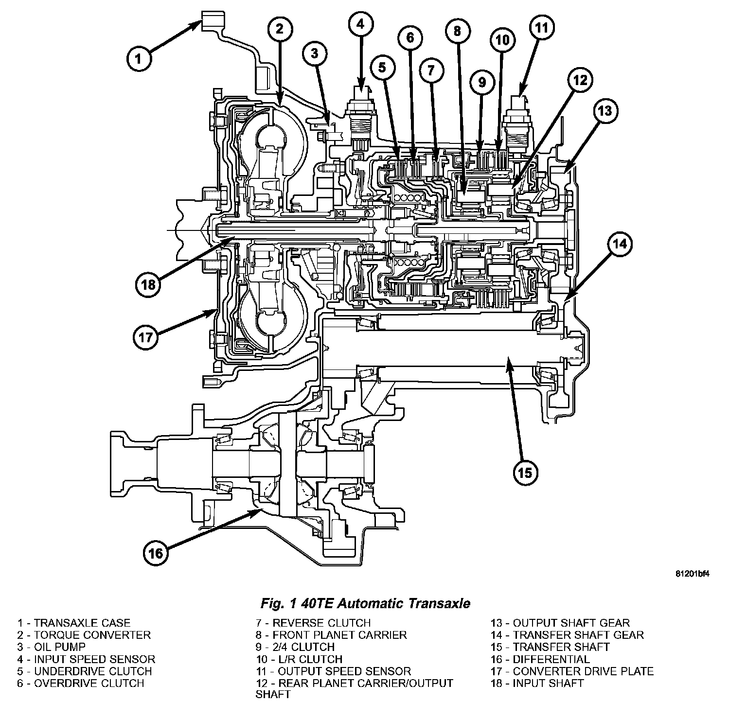 The 40TE (Fig. 1) is a four-speed transaxle that is a conventional hydraulic/mechanical assembly with an integral differential, and is controlled with adaptive electronic controls and monitors. The hydraulic system of the transaxle consists of the transaxle fluid, fluid passages, hydraulic valves, and various line pressure control components. An input clutch assembly which houses the underdrive, overdrive, and reverse clutches is used. It also utilizes separate holding clutches: 2nd/4th gear and Low/Reverse. The primary mechanical components of the transaxle consist of: