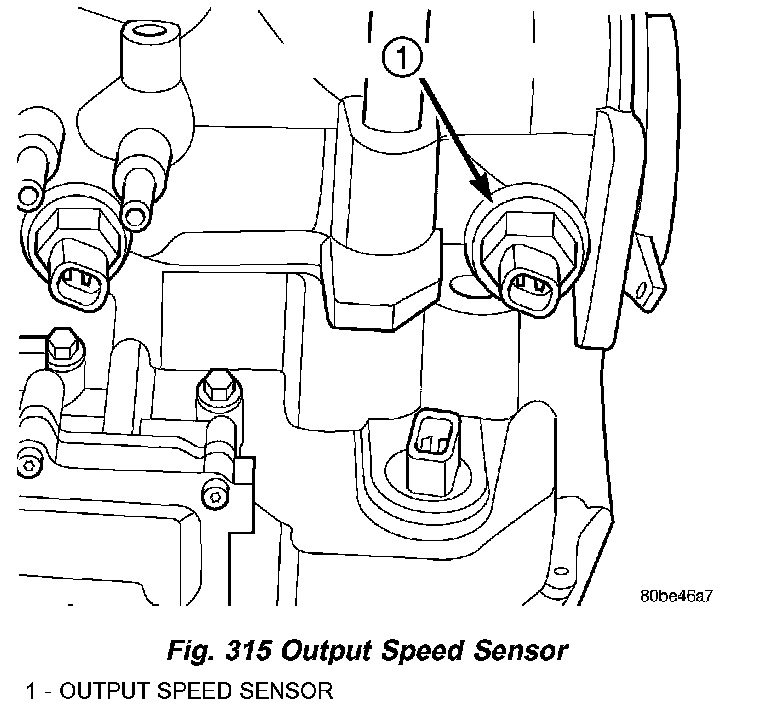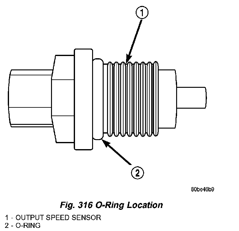 The Output Speed Sensor is a two-wire magnetic pickup device that generates an AC signal as rotation occurs. It is threaded into the transaxle case (Fig. 315), sealed with an O-ring (Fig. 316), and is considered a primary input to the Powertrain/Transmission Control Module.