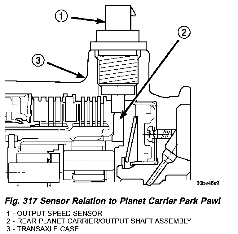 The Output Speed Sensor provides information on how fast the output shaft is rotating. As the rear planetary carrier park pawl lugs pass by the sensor coil (Fig. 317), an AC voltage is generated and sent to the PCM/TCM. The PCM/TCM interprets this information as output shaft rpm.