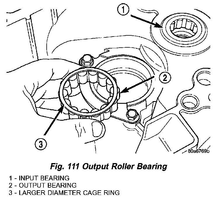 1. Remove caged roller bearing from output bearing race (Fig. 111).