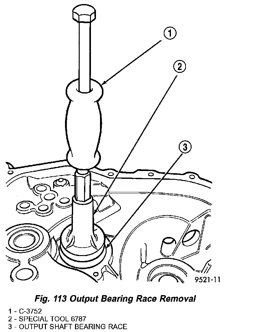 3. Install tool #6787 and slide hammer (Fig. 113). Tighten tool to output bearing race.