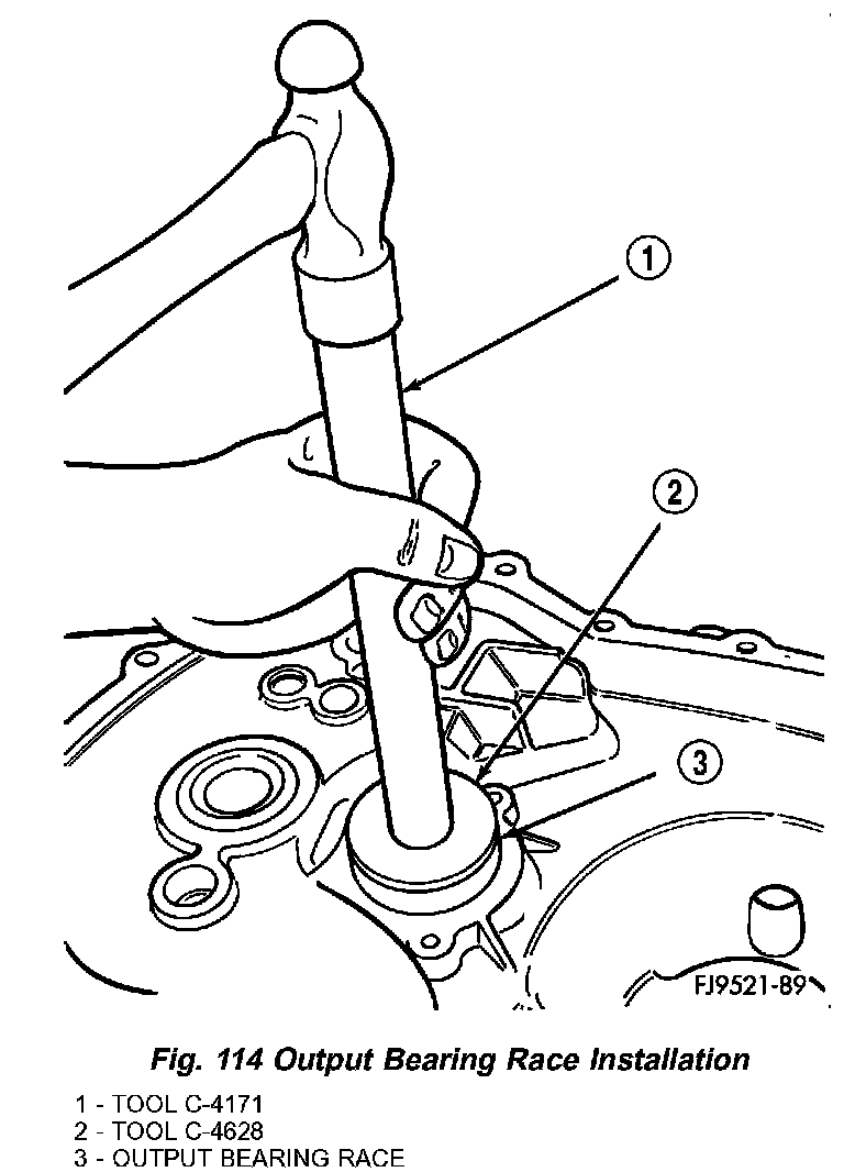 2. Insert tool #4628 with C-4171 into output bearing race (Fig. 114). Tap race into bore. Install output bearing into race. Verify that the larger diameter cage is facing outward. Position bearing retaining strap. Tighten bolts to 11 Nm (96 inch lbs.).