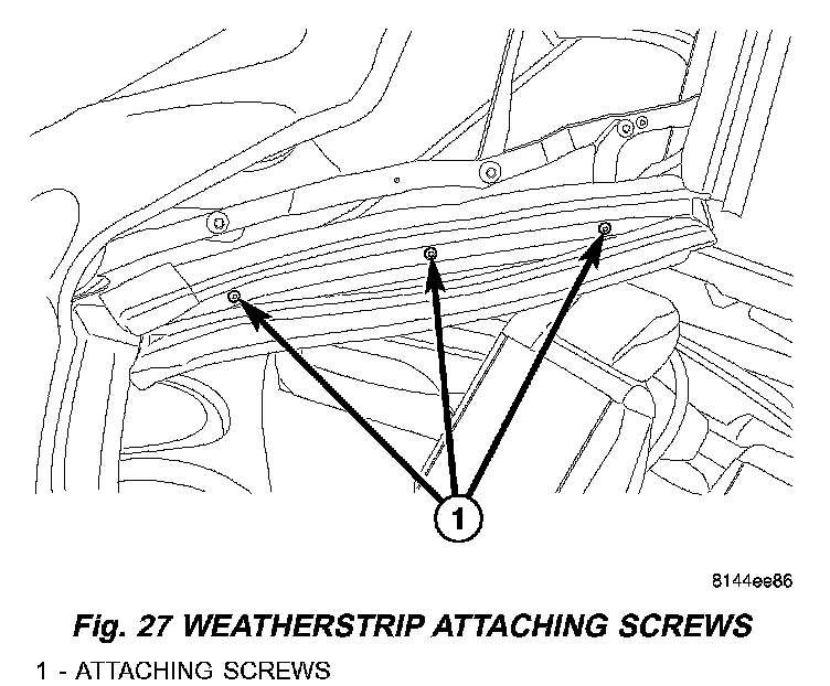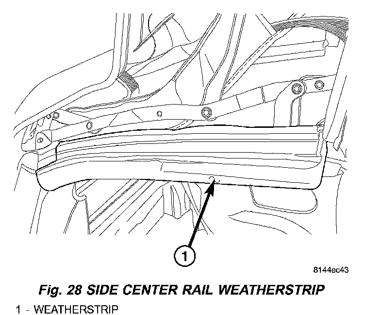 5. Install weatherstrip retainer (Fig. 27), and weatherstrip for side glass on the center side rail (Fig. 28).