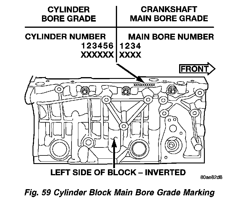 The grade marks for the cylinder block main bearing bore grade is located on the pan rail just below the left side engine mount bracket (Fig. 59). These marks are read left to right, corresponding to main bore 1, 2, 3, 4.
