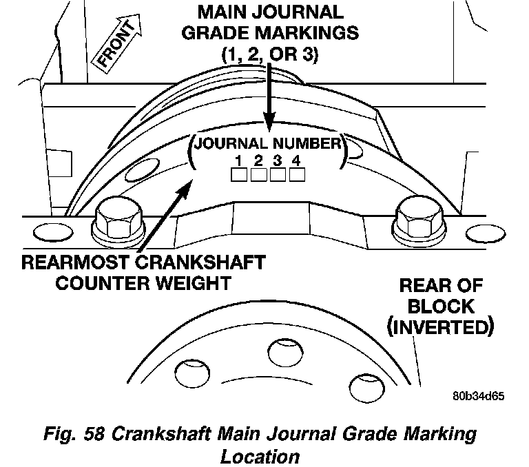 The grade marks for the crankshaft are located on the rearmost crankshaft counter weight as shown in (Fig. 58). The crankshaft journal grade marks are read left to right, corresponding with journal number 1, 2, 3, 4.