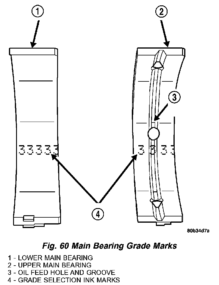 NOTE: Service main bearings have a number from 1-5 marked in ink on the bearing surface (Fig. 60). For verification, use the MAIN BEARING SELECTION CHART for number to size identification.