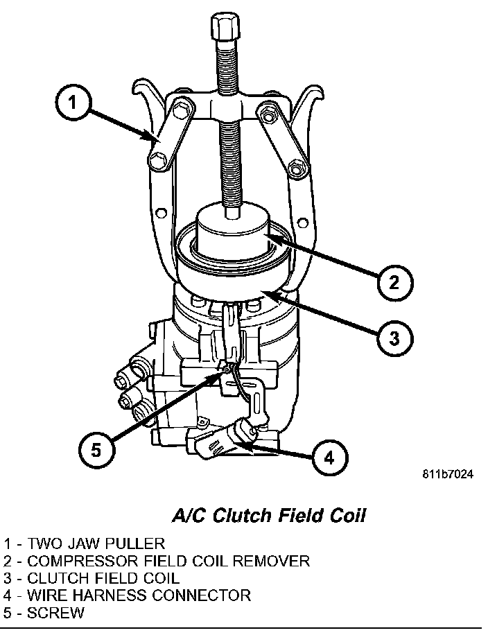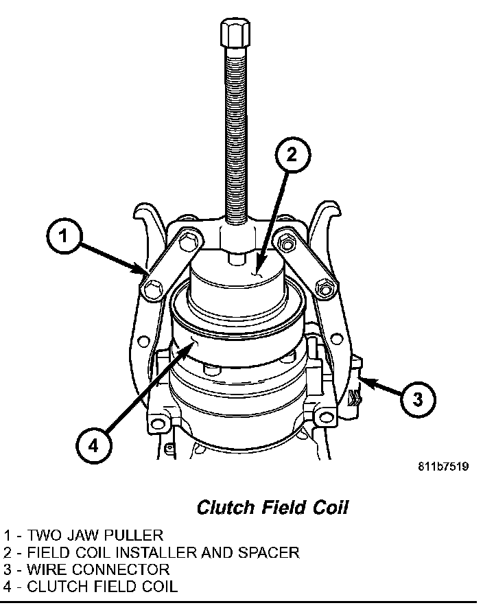 13. Remove the clutch field coil from the compressor with the compressor field coil remover (Special Tool 9354 in Kit 9349) and a two jaw puller.