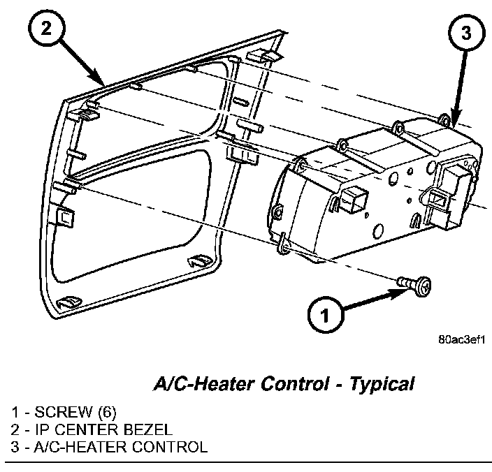 3. Place the center bezel on a workbench and remove the six screws that secure the A/C-heater control to the center bezel.