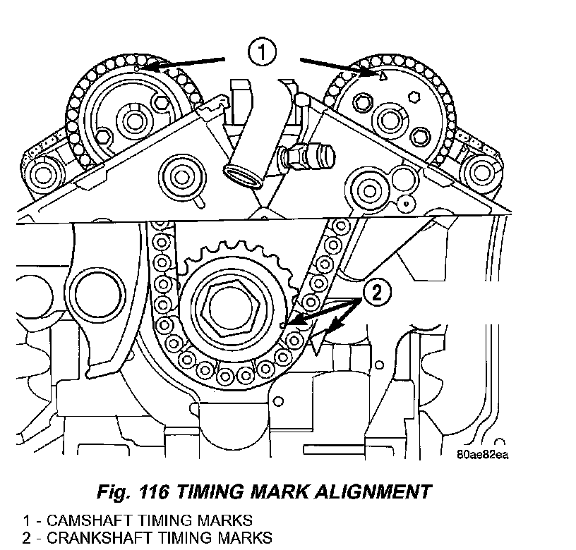 Align crankshaft sprocket timing mark to mark on oil pump housing (Fig. 116). The mark on oil pump housing is 60° ATDC of #1 cylinder.