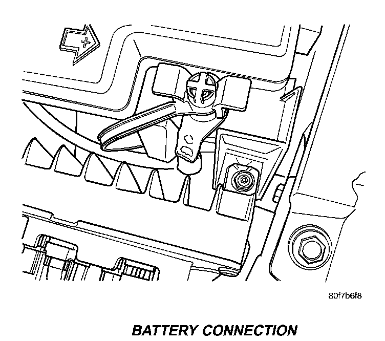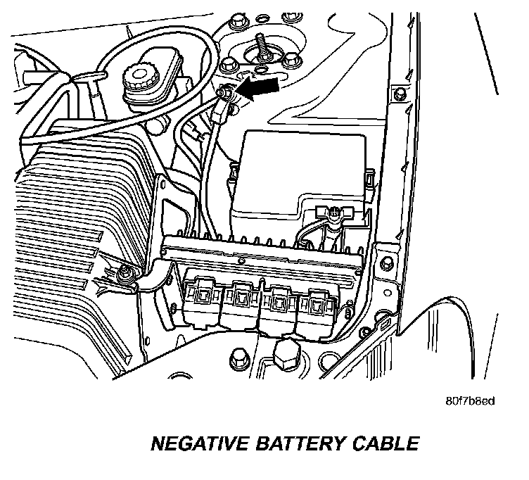 WARNING: IF THE NEGATIVE BATTERY CABLE IS NOT DISCONNECTED THE POSSIBILITY OF DAMAGING THE POWERTRAIN CONTROL MODULE BY CONTACTING THE POSITIVE BATTERY CABLE AT THE PDC.
