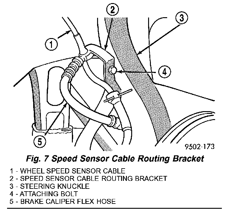 7. Install wheel speed sensor cable routing bracket on steering knuckle (Fig. 7) and securely tighten attaching bolt.