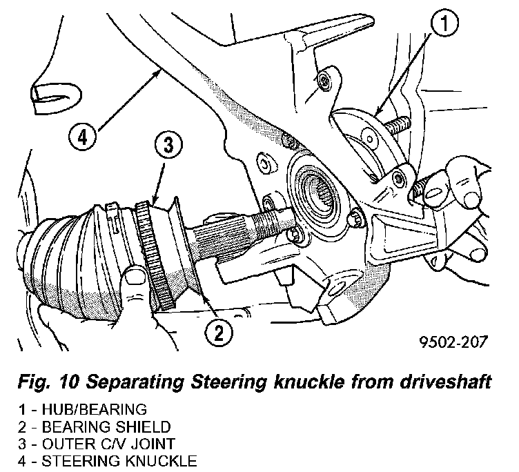 11. Separate steering knuckle from outer C/V joint. Separate steering knuckle from outer C/V joint holding driveshaft in place while pulling steering knuckle away from outer C/V joint (Fig. 10).
