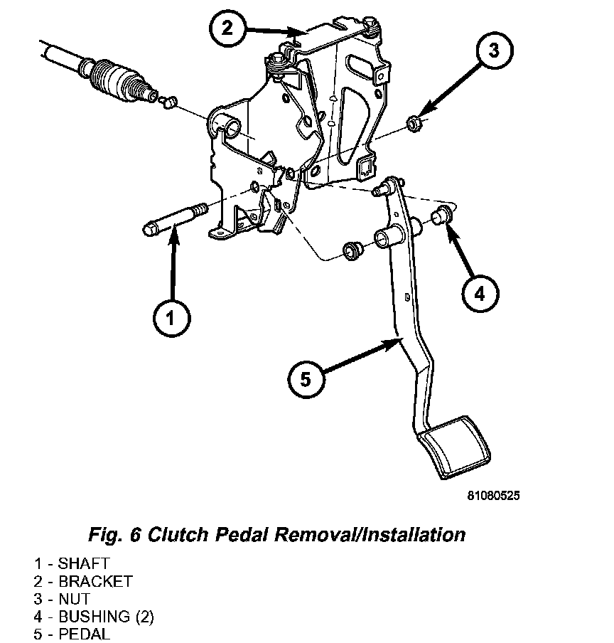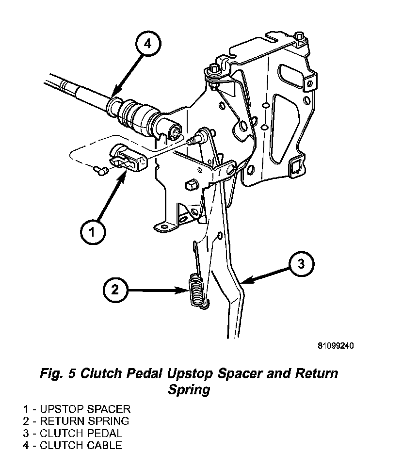 3. Remove clutch upstop spacer retainer clip from pedal pin (Fig. 5). Remove cable/spacer from pedal.