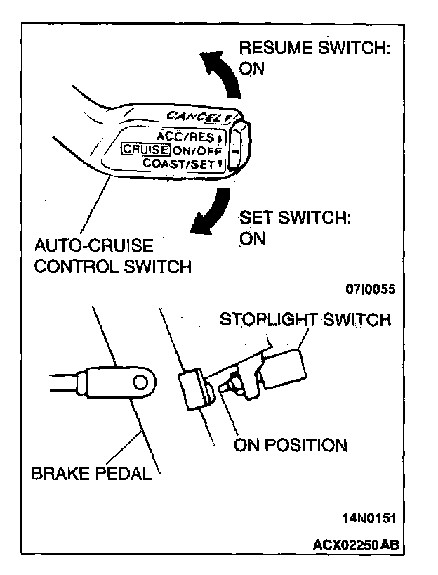 1. Turn the ignition switch to the ON position while holding the auto-cruise control switch in the SET1 (down) position. Then, within one second, more the auto-cruise control switch up to the RES position.