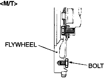 CAUTION: Do not remove the flywheel mounting bolt shown by the arrow. If this bolt is removed, the flywheel will become out of balance and damaged.