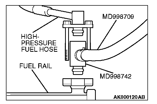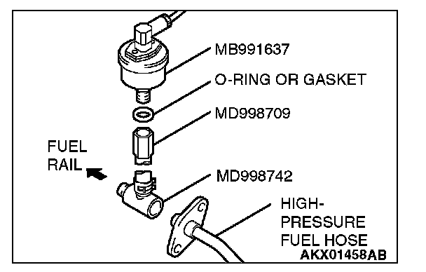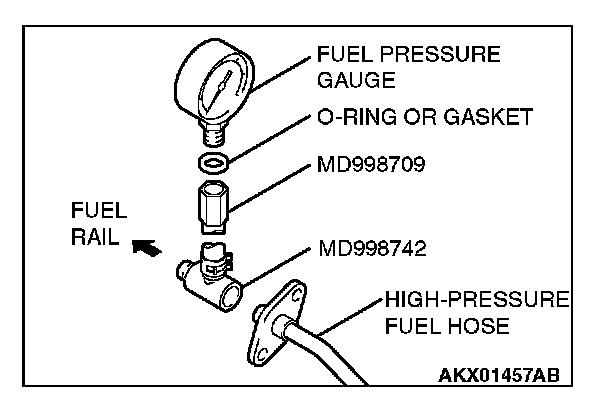 2. Place a suitable O-ring or gasket on assembled special tools MD998709 and MD998742 and install the fuel pressure gauge.