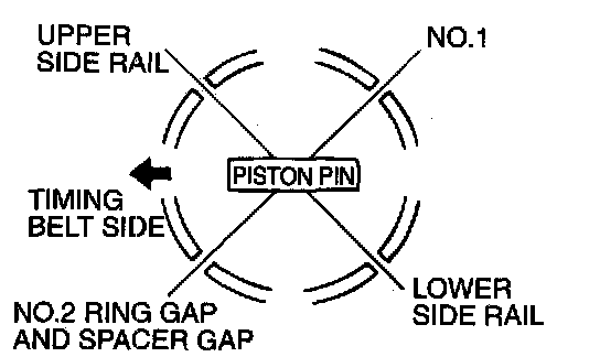 2. Arrange the piston ring and oil ring gaps (side rail and spacer) as shown in the illustration.